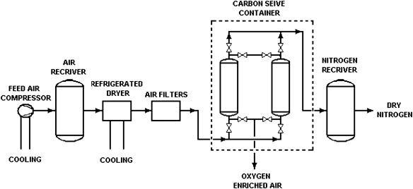 Gas Separation: The compressed air enters the adsorption towers where, under high pressure, the carbon molecular sieve preferentially adsorbs oxygen, allowing nitrogen to be collected as the product gas.